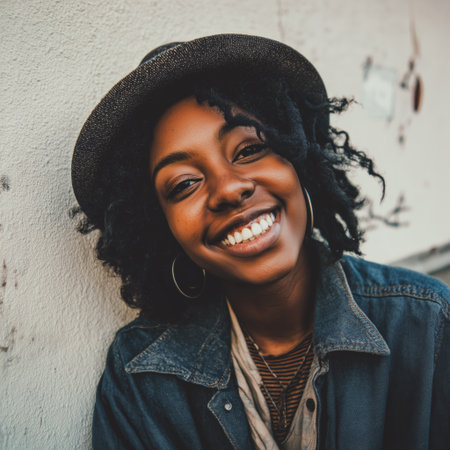 A captivating portrait of a young woman smiling with joy, showcasing her beauty and elegance through stylish accessories and soft lighting.