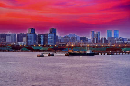 City night view skyline and coastline scenery