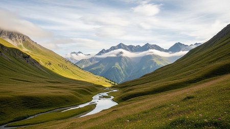 With showing winding river flowing through a lush green mountain valley with dramatic peaks and clouds in the background. resolution