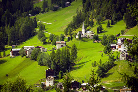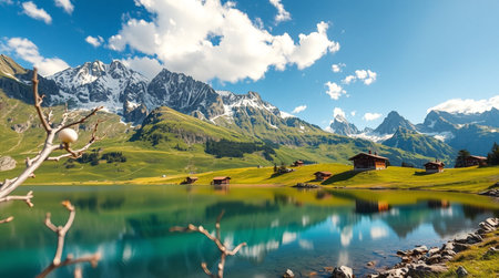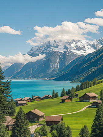 Swiss Alps mountains landscape with alpine village and lake, Switzerland
