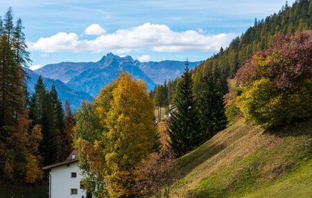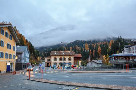 ALBULA-ALVRA, SWITZERLAN - NOVEMBER 8, 2019. View of the municipality of Albula-Alvra in the fall on a cloudy day. Albula Region, canton of Graubuenden, Switzerland.