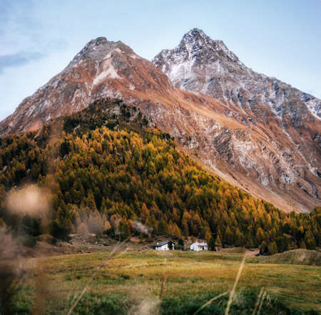 Small houses in Maloja village against mountain at sunset in autumn, Maloja Pass, Switzerland.