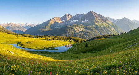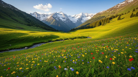 A breathtaking view of a lush alpine meadow filled with a variety of colorful wildflowers. The meadow is surrounded by majestic snow-capped mountains and a clear, winding stream. The scene is vibrant and serene, capturing the natural beauty of the high-altitude landscape.