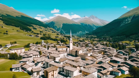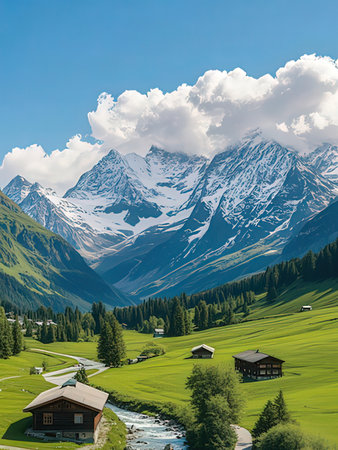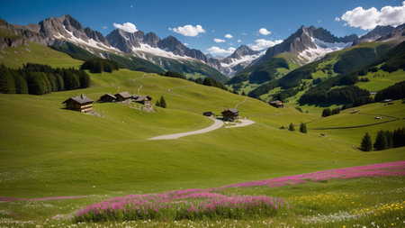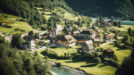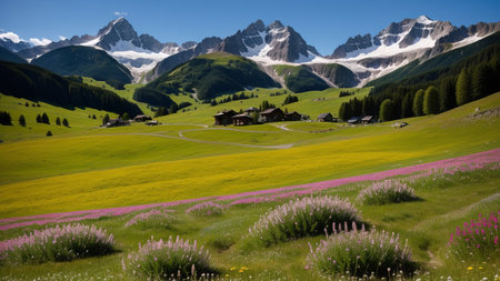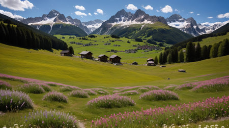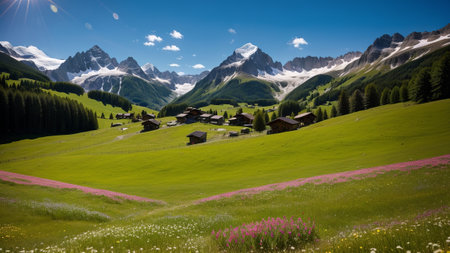 A picturesque alpine village is surrounded by lush greenery and rolling hills, with traditional wooden houses dotting the landscape under a clear blue sky.