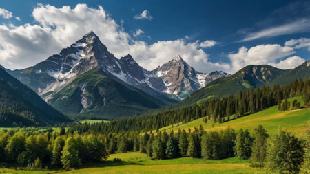 Beautiful mountain landscape with snow-capped peaks.