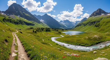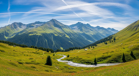 Panoramic view of alpine meadow and mountain stream in the Swiss Alps
