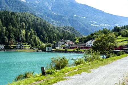 Beautiful view of the lake Muta (Haidersee) and Ortler peak, located near the village St. Valentin, Alps, Italy, Europe. Landscape photography