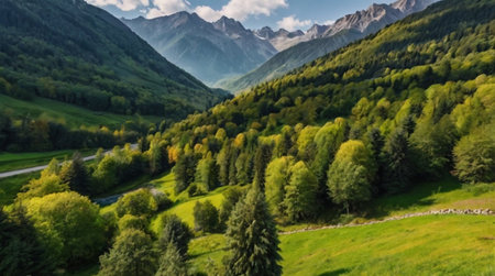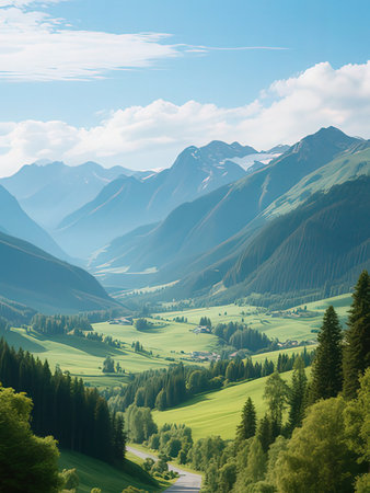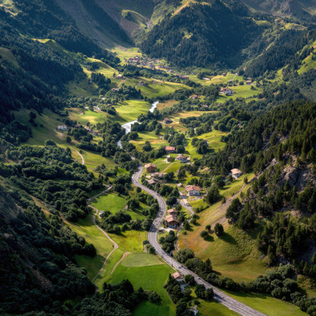 Captivating view of a serene mountain valley featuring lush greenery, winding roads, and a picturesque village, perfect for nature lovers and travelers.