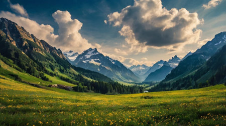 Panoramic view of the mountains and meadows in the Swiss Alps
