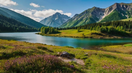 panoramic view of alpine lake in summer. beautiful nature scenery