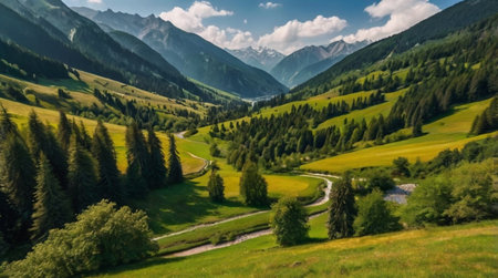 Panoramic view of beautiful alpine meadows and mountains in summer