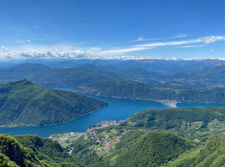 View from Mount San Salvatore. View of the mountains, Lake Lugano and Campione di Italy. Switzerland