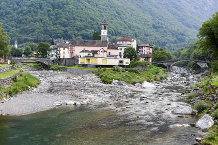 View from the Ponte dei Salti to the beautiful village Lavertezzo with it's famous church in the canton Ticino, Switzerland