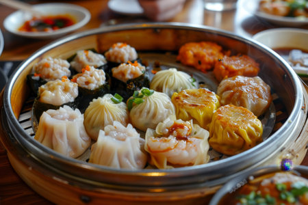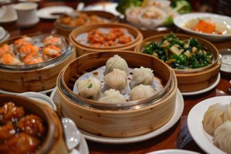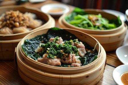 Chinese Cantonese dimsum meal served in traditional bamboo steamer