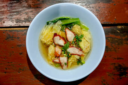 Dumpling water is square sheets of wheat dough enclosing mince pork, boiled in soup