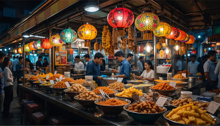 A bustling night market scene comes alive under the warm glow of hanging lanterns, showcasing an array of delicious treats and happy customers. The air is filled with enticing aromas and a festive mood.