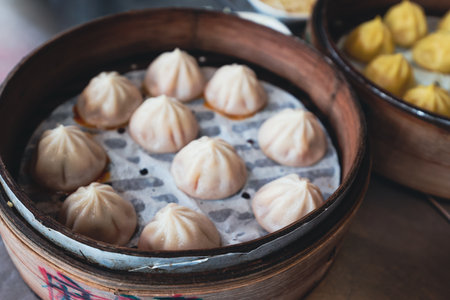 Chinese dumplings or xiao long bao in bamboo tray, famous food in Shanghai, China