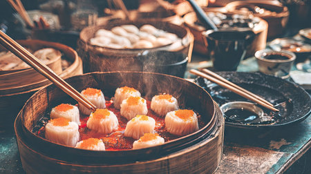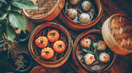 An overhead shot showcases diverse dim sum varieties inside traditional bamboo steamers. The food items feature vibrant orange and white colors, arranged against warm wooden textures. The composition uses natural lighting, suggesting an inviting setting, suitable for culinary advertising or editorial purposes.