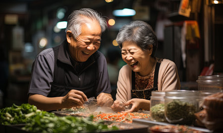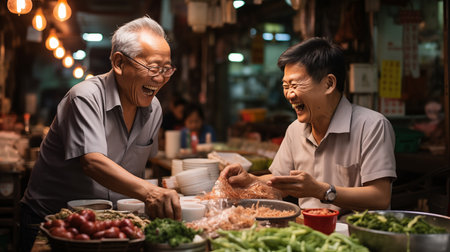 Asian senior couple enjoy eating noodle in the street food market.