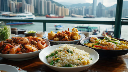 Experience a vibrant seafood meal with a stunning waterfront view, featuring fresh shrimp, flavorful rice, and colorful vegetables in a serene atmosphere.