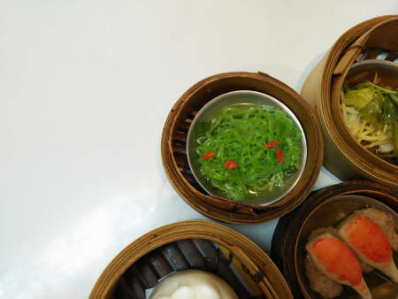 Chinese dim sums in bamboo steamed basket on white background with copy space.