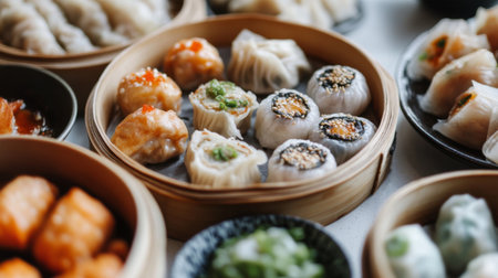 A Delicious dim sum display with various dumplings and buns