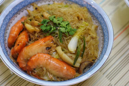 Rice noodles with shrimps and vegetables in a bowl.