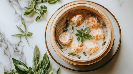 A beautiful arrangement of steamed dumplings on a bamboo tray, surrounded by fresh herbs. Ideal for showcasing Asian cuisine and food artistry.