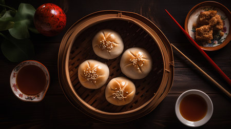 Traditional chinese bun baozi on dark wooden background, top view