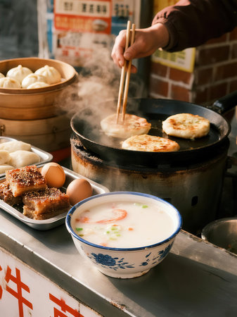 A steamy, comforting bowl of rice porridge on a cold, misty morning, with side dishes of salted eggs, pickled radish, and spicy chili paste completing the scene.