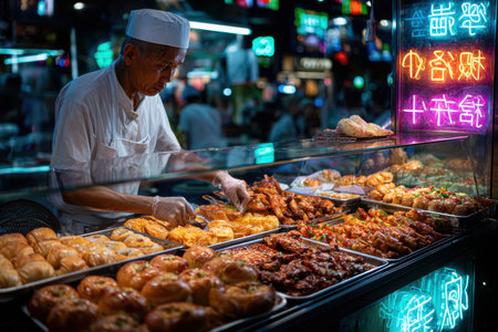 A chef arranges food in a display case at a vibrant night market