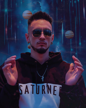 Portrait of a young man in a hoodie and sunglasses against the background of the night sky with planets.