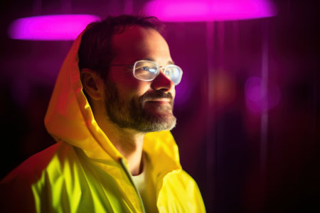 Portrait of a bearded man in a yellow raincoat on a dark background