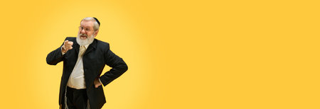 Banner. Mature man with dissatisfied look points his finger at camera against yellow studio background with negative space to inert text. Purim holiday, celebration Pesach or Passover concept. Ad