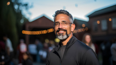In a lively outdoor setting, a young man smiles warmly, showcasing his friendly demeanor.