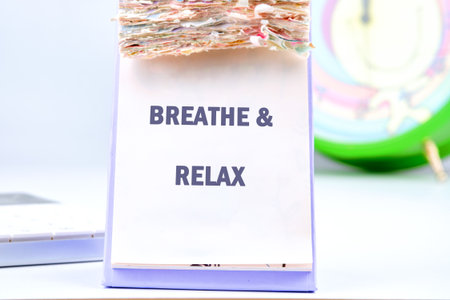 A simple stand features the words breathe and relax, inviting everyone to pause and enjoy a moment of tranquility amid a serene background with a clock
