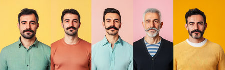 Collage of men with different mustaches posing against color backgrounds, AI Generated