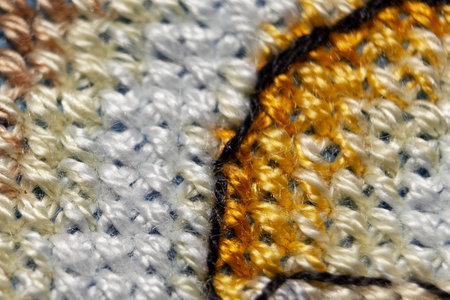 Cross-stitch. Macro photography of embroidery sites. Shooting with a small bluff of sharpness. Bright patterns on the canvas.