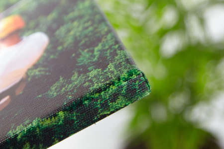 Canvas print, closeup. Stretched photo with gallery wrap method of canvas stretching on stretcher bar. Edge and corner of photography, side view