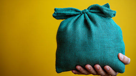 Hand holds a small burlap sack against a vibrant yellow backdrop, symbolizing savings, investment, and financial security, perfect for concepts related to personal finance and wealth accumulation