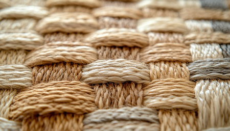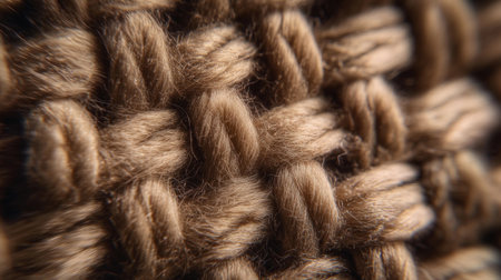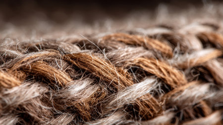 Extreme close-up of a woven natural fiber texture, showcasing the intricate interlacing of brown and beige...