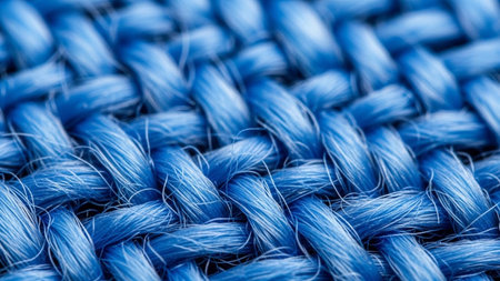 An extreme close-up macro captures the intricate texture of a tightly woven blue fabric. The focuses on the individual threads and fibers, showing how they are interlaced to create a dense and robust weave. The color is a deep, rich blue, reminiscent of indigo or navy. The texture appears slightly coarse and rustic, highlighting the natural and its construction. This detailed view reveals the underlying pattern and structure of the textile, making it an background or detail shot for fashion,...