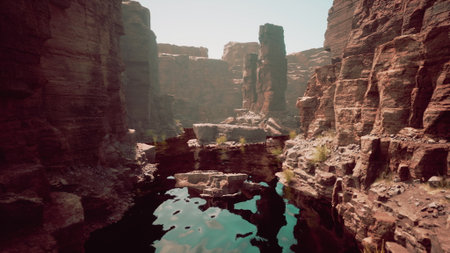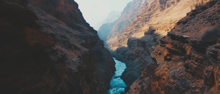 Flowing water winds through a rugged canyon, with high rock walls framing the scene. Sunlight glimmers off the surface, creating a serene ambiance and showcasing natural beauty.