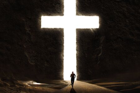 Man Running Towards Giant Bright Cross with Glowing Rays