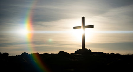 The silhouette of a wooden cross stands prominently on a rocky hilltop against a bright sky at sunrise. The sun is positioned behind the cross, creating a strong backlight and a radiant glow. A vibrant rainbow-colored lens flare streaks across the image from the left, adding a magical and ethereal quality to the scene.