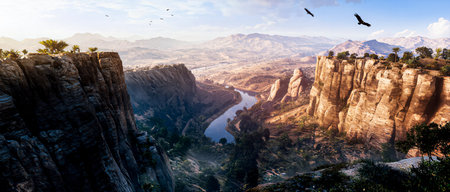 This captivating scene showcases a winding river flowing through a rugged canyon. Sunlight highlights the colorful rocky formations, creating a breathtaking display of natures beauty.