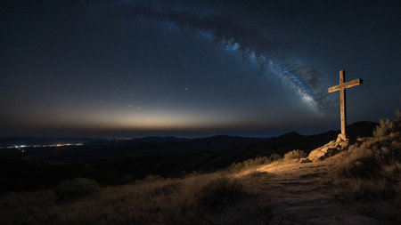 A stunning night photography capturing a wooden cross on a hill under the starry sky with the Milky Way visible, creating a tranquil and reflective ambiance over a distant horizon. AI generated image