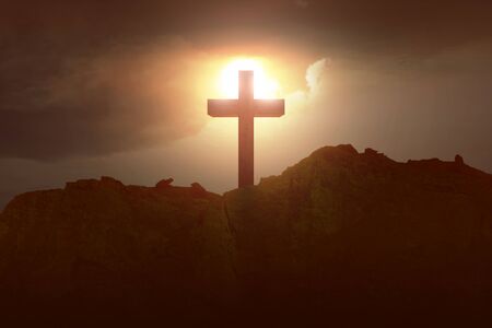 Crucifixion Of Jesus Christ - Cross At Sunset. Silhouette cross on Calvary mountain sunset background. Easter concept