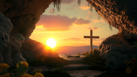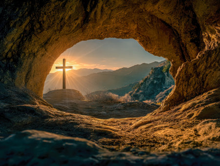 A wooden cross stands at the entrance of a cave as the sun rises, creating a serene and hopeful scene.