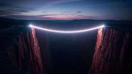 showing glowing light bridge spanning a deep canyon at dusk. resolution